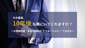 当社では、会社規模、施工実績、品質管理、安全管理、緊急対応、アフターケアの6つの観点から優良業者を厳選し、ご紹介しています。信頼性の高い経営基盤を持ち、豊富な実績と高い技術力を有することはもちろん、施工後も安心していただけるアフターサポートが充実した業者のみを選定しています。お客様に最適なパートナーをご提供し、安心と満足をお届けします。